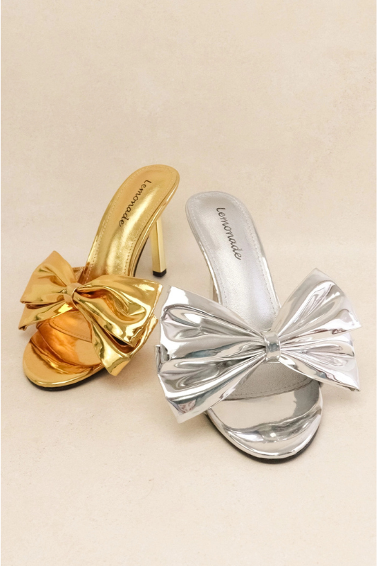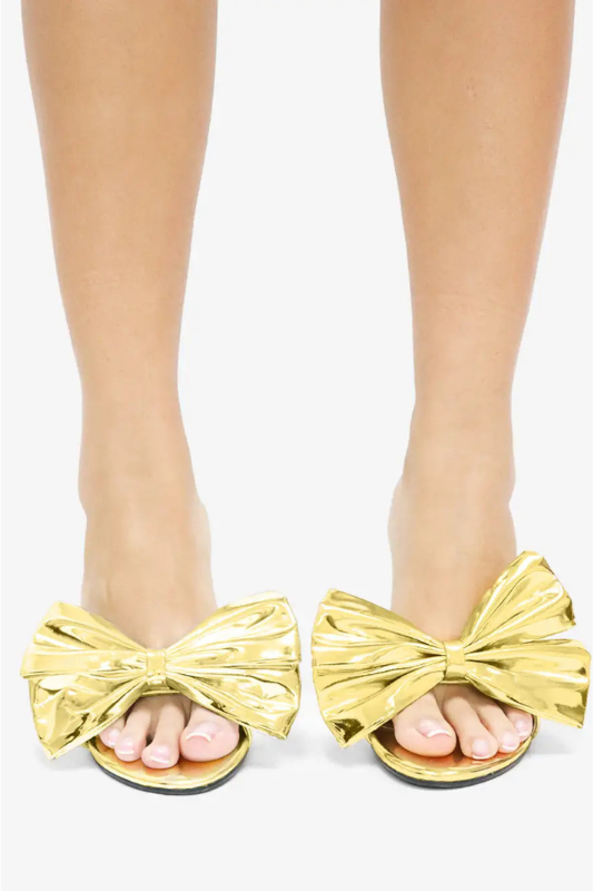 A dazzling blend of glamour and effortless sophistication. Wrapped in high-shine metallic gold, these statement mules demand attention with a bold oversized bow that exudes elegance with a playful edge. The open-toe slip-on design makes them as effortless as they are striking, perfect for those who step into every moment with confidence.